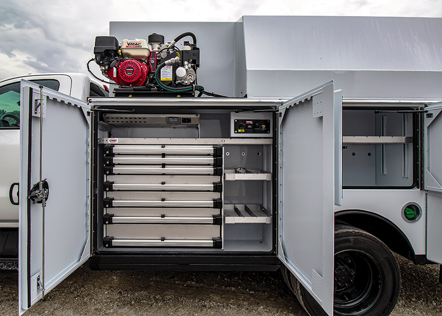 You can custom design a canopy service body for any service application that requires the safety and security of working and storing items within the canopy. They are popular in cold climates. Canopy bodies can be upfitted for lube service, roadside assistance, and trade professions such as electrical, telecommunications, and utilities.