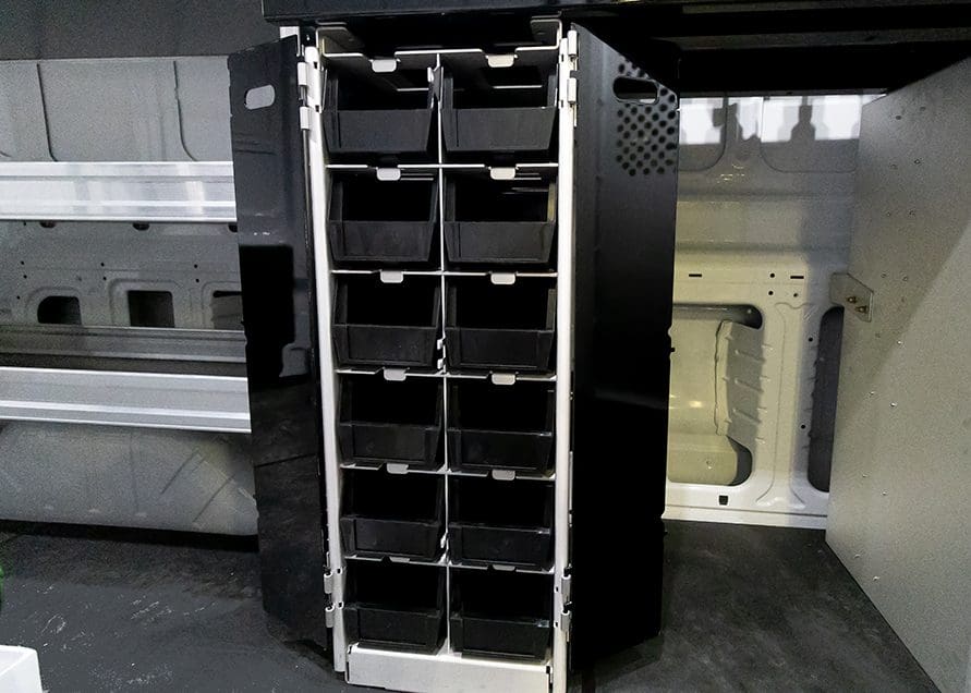 Additionally, they can be custom designed to fit your work truck body. Provide us with the width and height requirements to best suit your needs; then, we deliver a high-quality custom bolt bin. Or, you can select one of our standard designs.